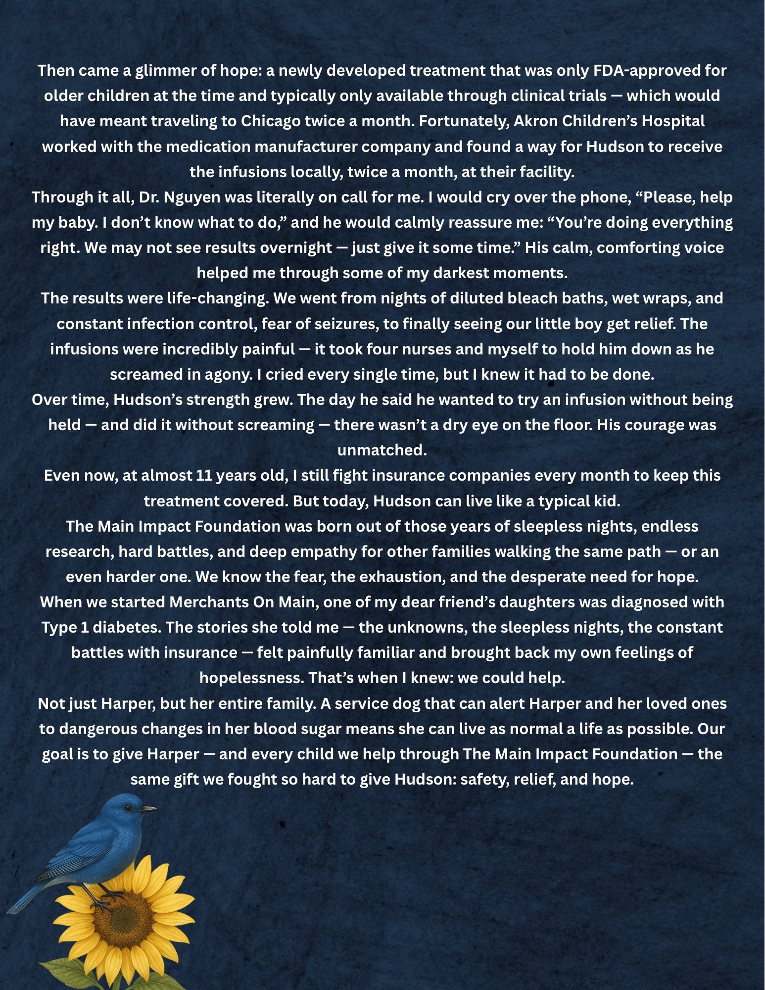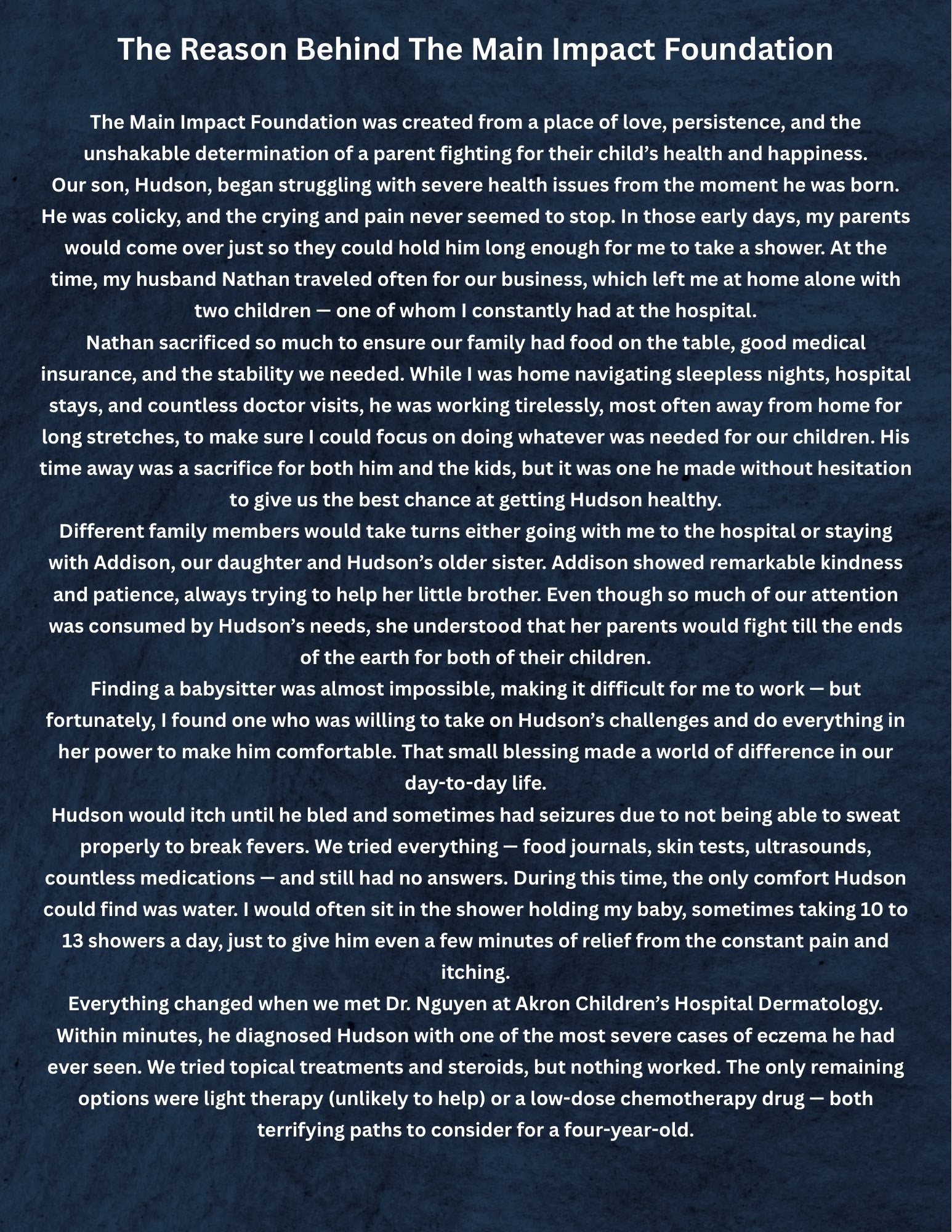 The Main Impact Foundation was created to give children and families meaningful opportunities for support and connection. Inspired by my son, Hudson, the foundation’s first initiative focuses on helping children in need of service dogs. Our first candidate, Harper, we are currently raising funds for her service dog and will join Hudson in selecting future recipients—empowering both children to lead with compassion and purpose.